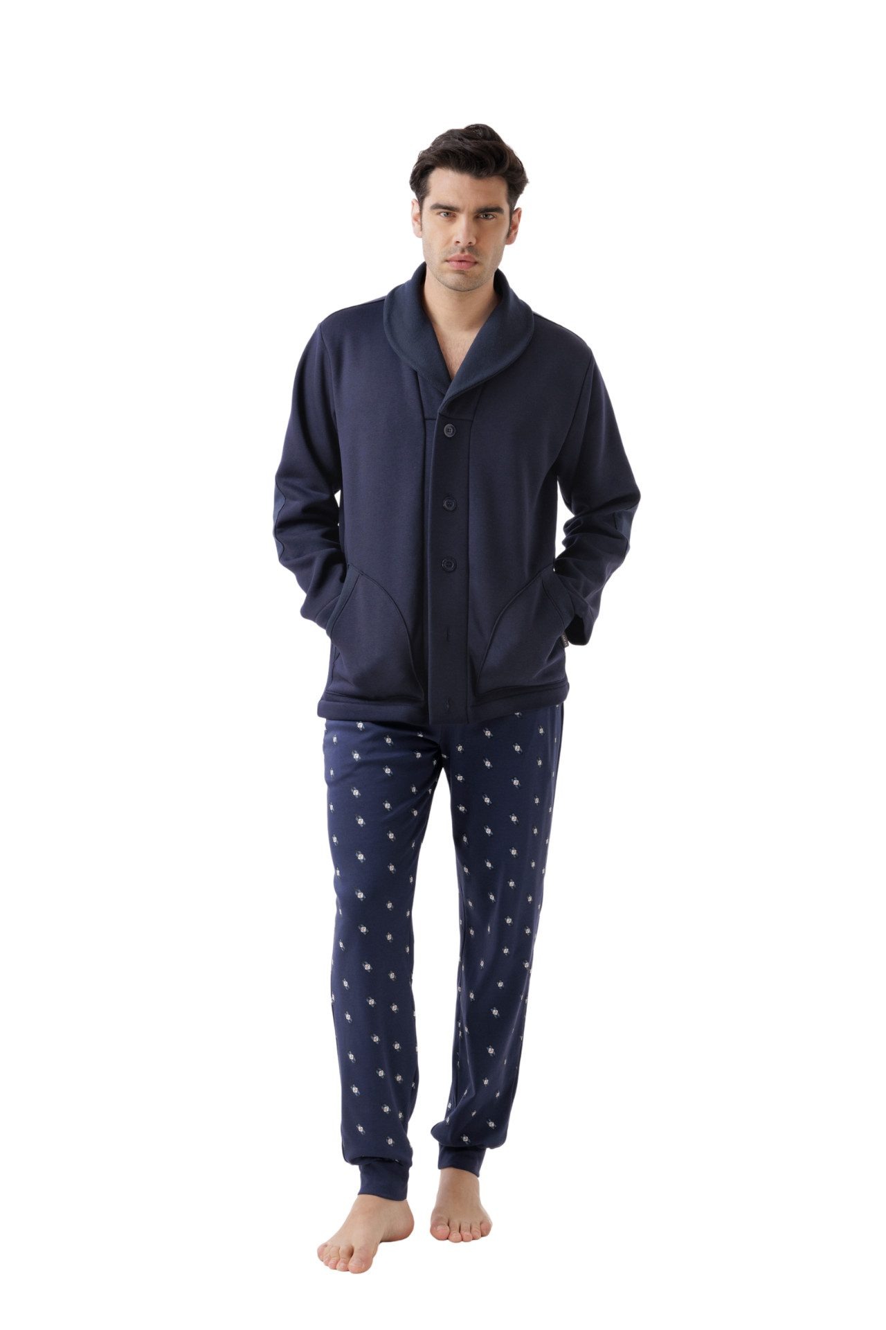 Il collo sciallato dona un tocco classico e raffinato, mentre la chiusura frontale con bottoni e le tasche laterali aggiungono praticità e funzionalità al capo. Perfetta da indossare sopra il pigiama o come capo homewear, garantisce una presenza sempre curata anche nei momenti di relax.