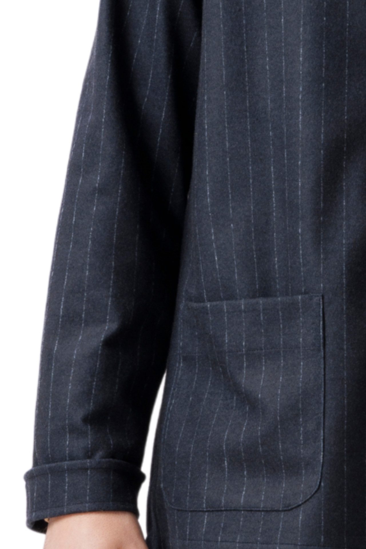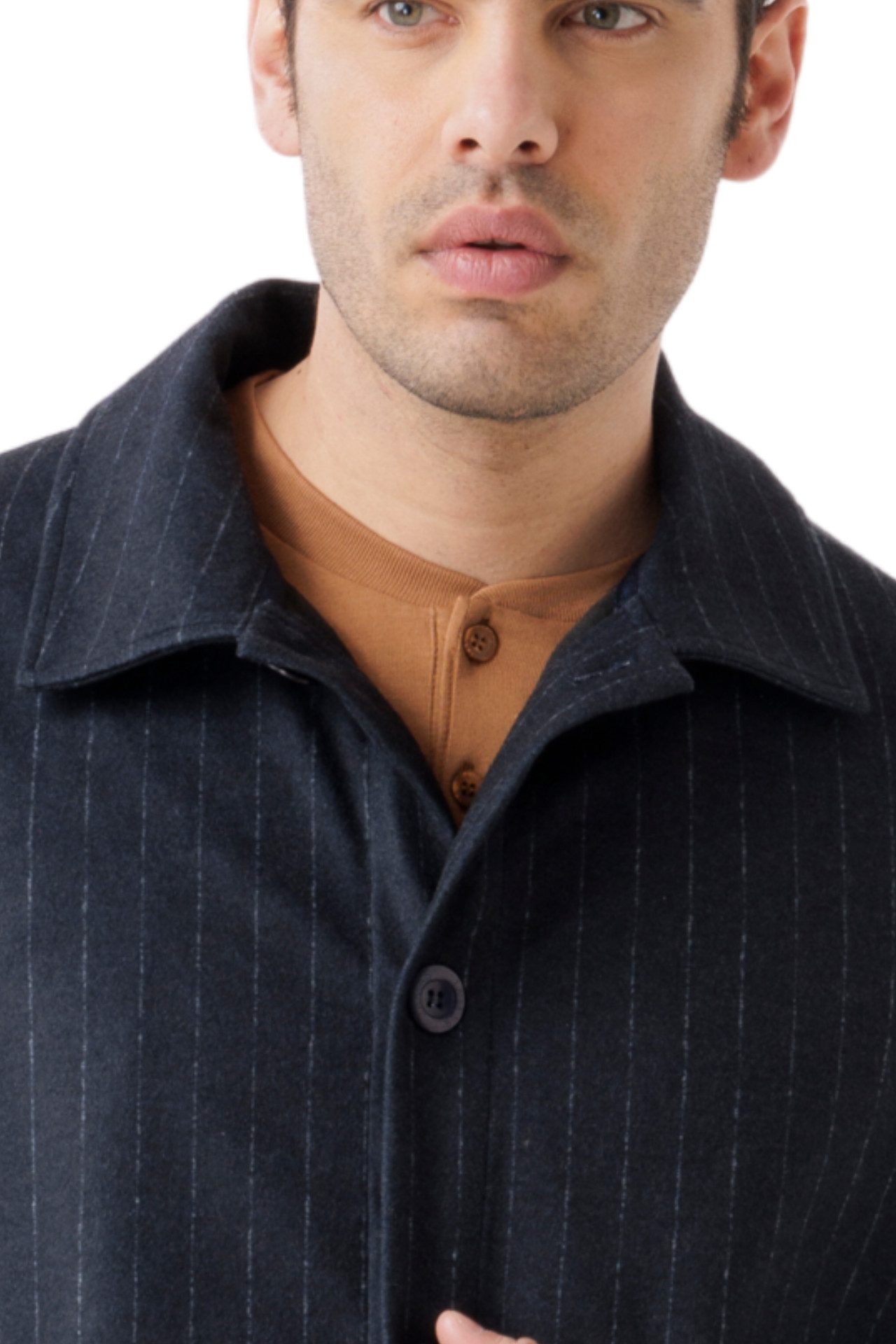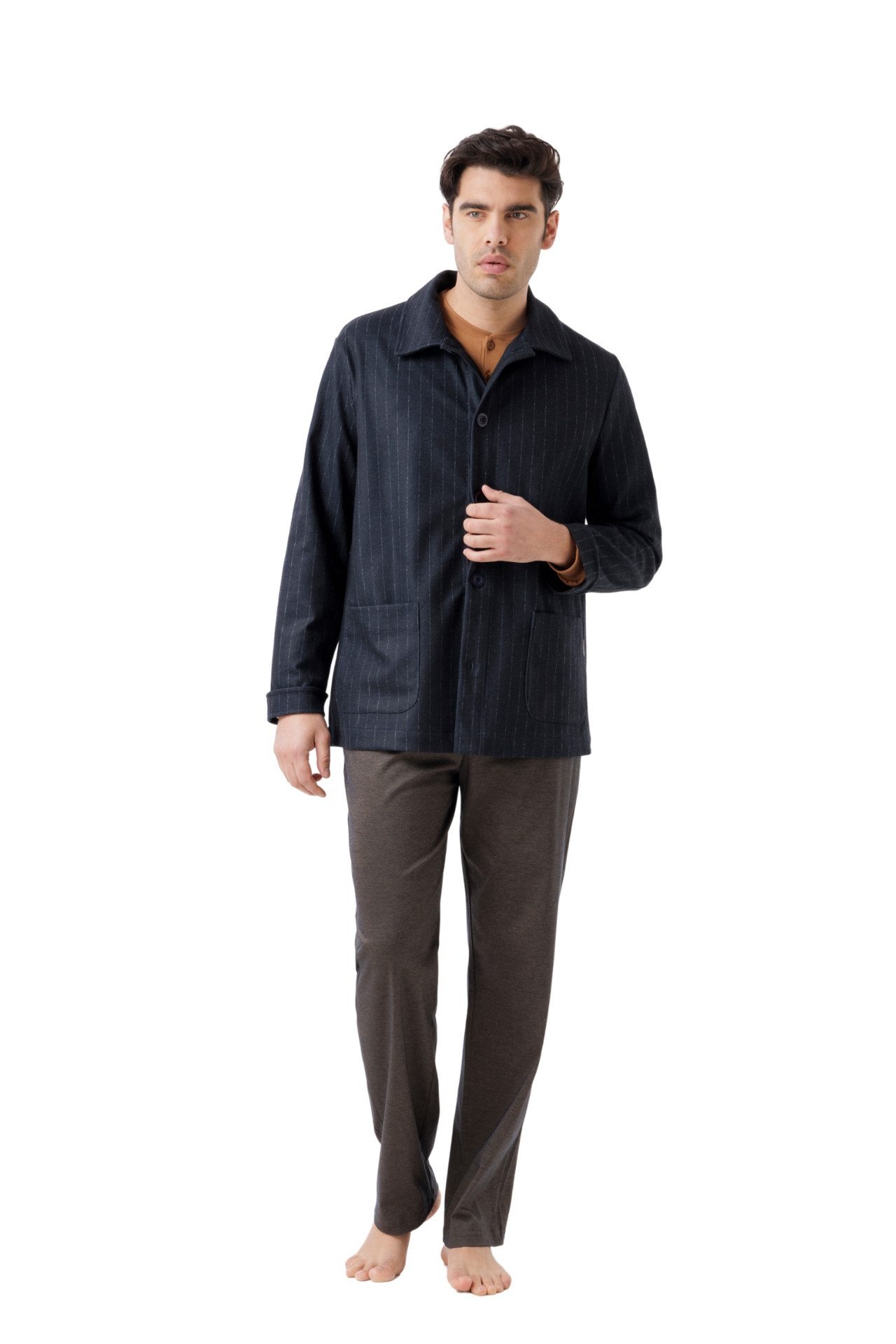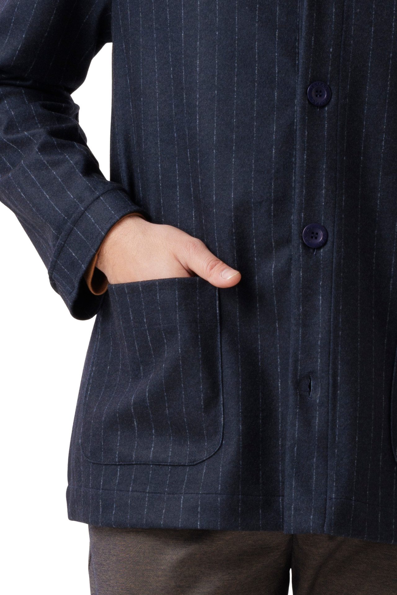 Il design presenta una fine fantasia gessata verticale che slancia la silhouette e dona un tocco sartoriale tipico della tradizione Jamas. La chiusura con bottoni frontali, il colletto classico e le pratiche tasche applicate completano un capo versatile e di qualità.