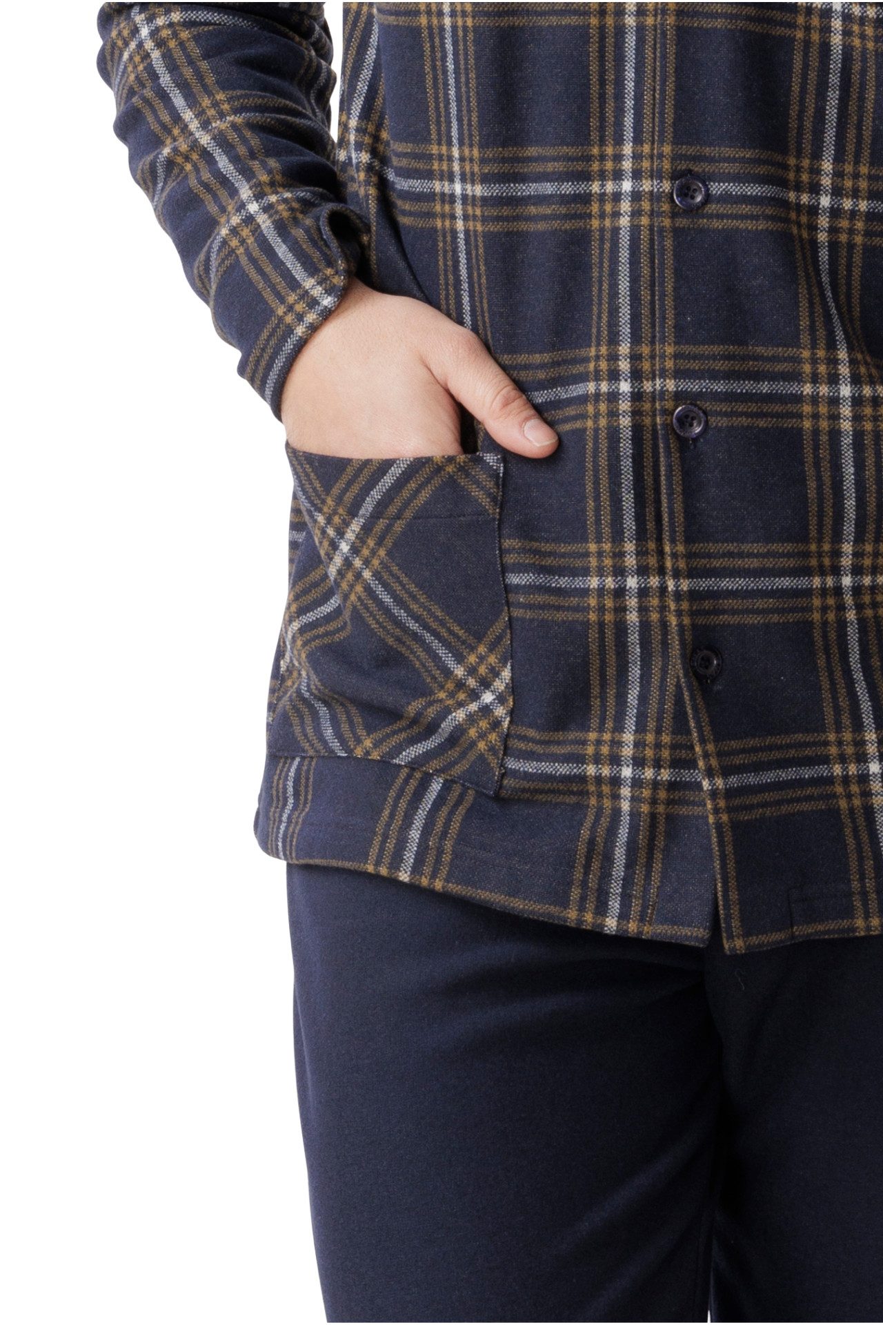 La giacca aperta con bottoni, caratterizzata da un elegante motivo a quadri, richiama uno stile classico e raffinato, impreziosito da tasche frontali applicate che uniscono funzionalità e gusto sartoriale.