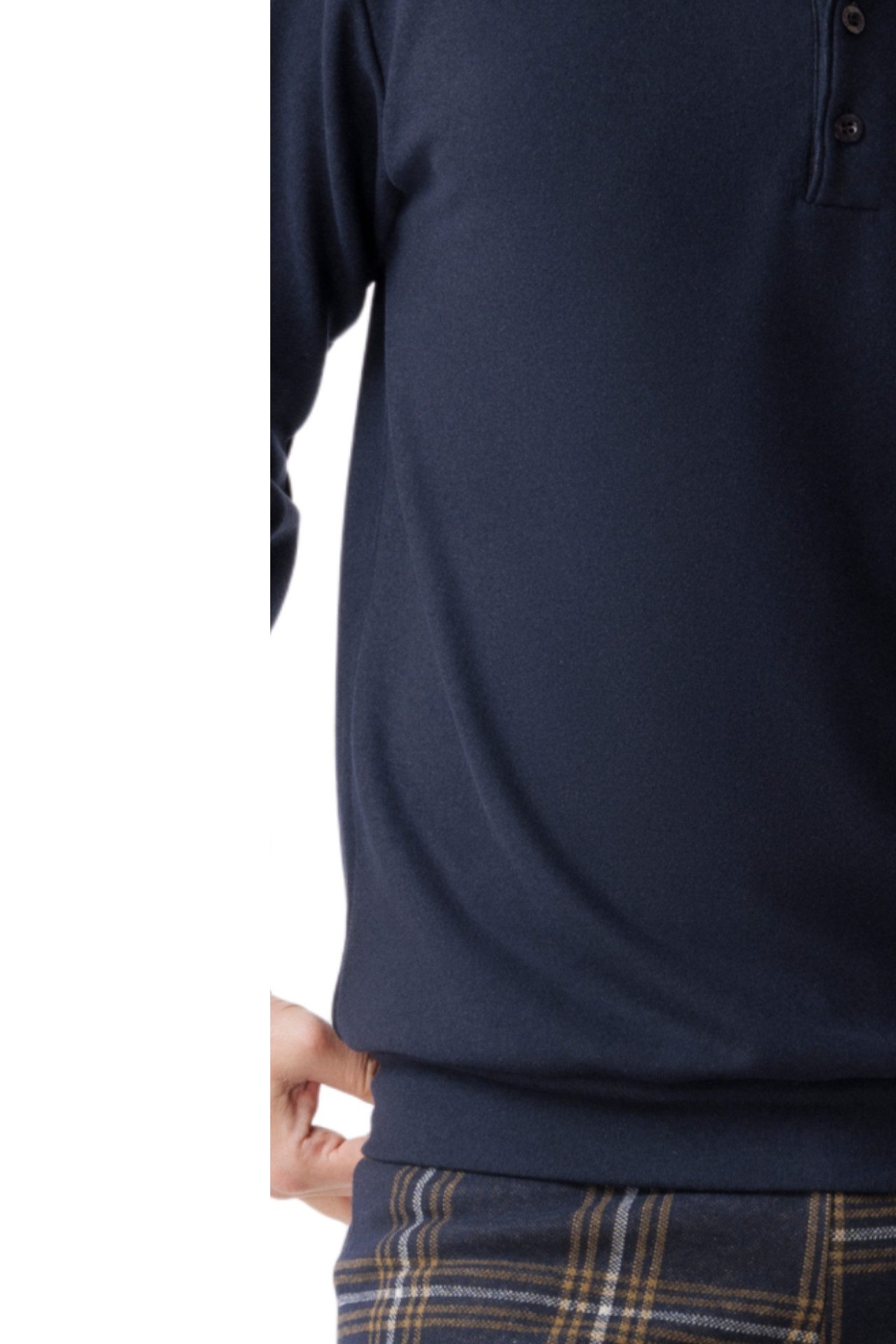 La maglia serafino, con apertura a tre bottoni, presenta un design essenziale ed elegante, valorizzato dal colore in tinta unita che dona uno stile sobrio e raffinato.